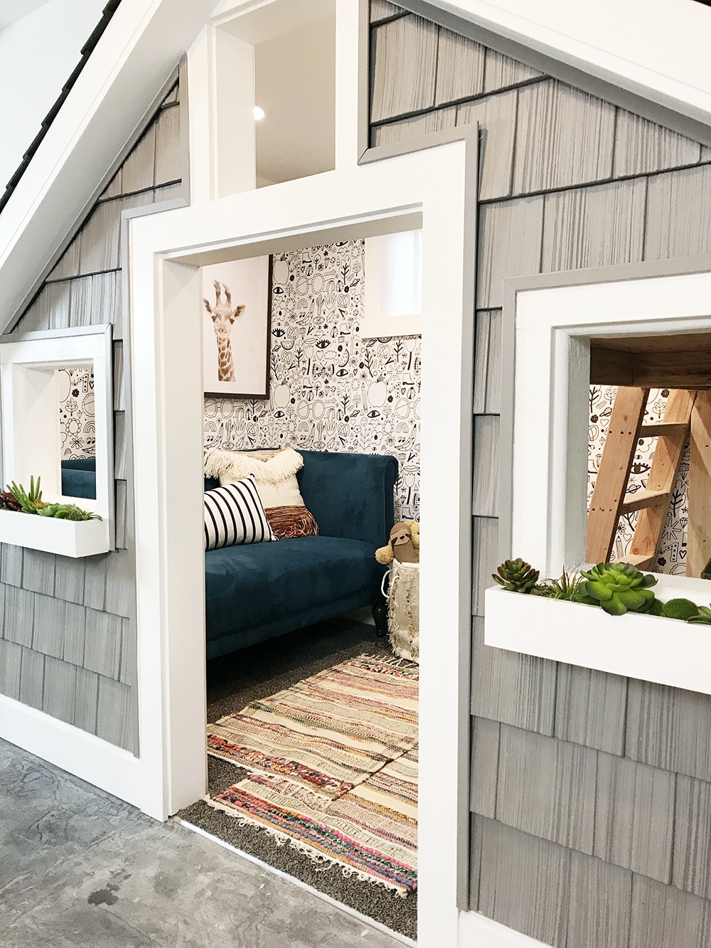 Solution: Lean into the awkward spot and use it to your advantage. Build out the space and turn that sore spot into an extra special space with a built-in play house (that can also house those stacks of toys behind closed doors).
