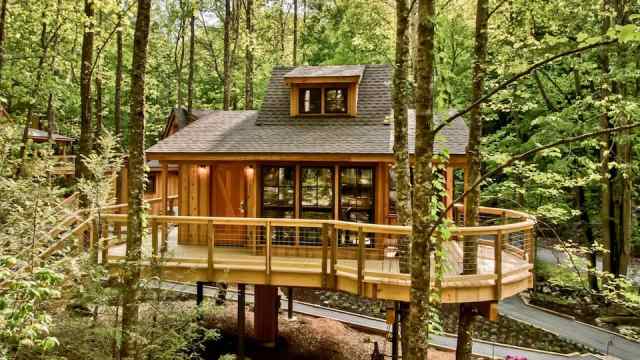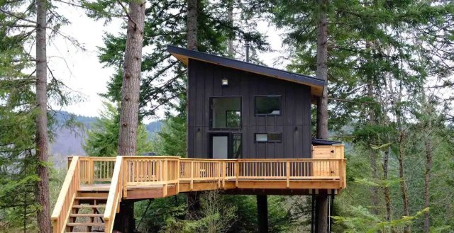 Three Douglas Fir trees fully support this 500-square-foot alpine modern treehouse. It sits 20 feet above the ground at its highest point, and floor-to-ceiling windows and skylights offer breathtaking views of the surrounding forest, the valley, and Mount Adams. Enjoy all the Columbia River Gorge has to offer and sleep in the forest's canopy. The treehouse sleeps six, but you can rent out the adjoining tiny house to sleep an additional two people.