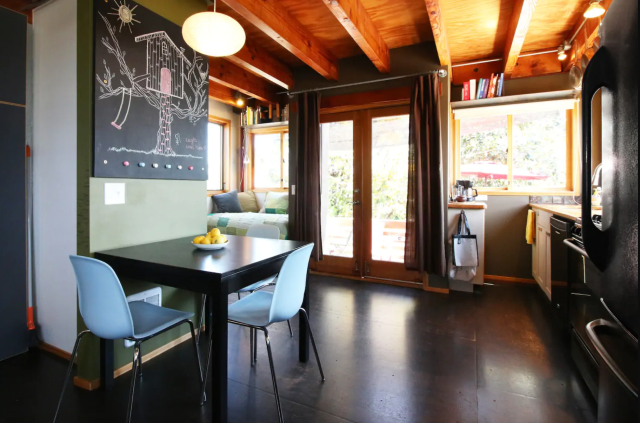 This haven is touted as an "urban oasis" since it's located in the bustling Golden Hill neighborhood of San Diego. The "cozy eclectic Southern California version of a tree house is elevated between two mature 30-foot trees." Enjoy the soaker tub and unwind in the reading nook before strolling to some great nearby restaurants. The elevated vantage point from the bedroom offers 180° views, including downtown, the Coronado Strand, and even parts of Mexico on a clear day. Cap off the day with a good selection of board games or by watching the smart TV.